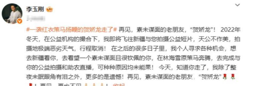 强行挽回自己形象为农产品做宣传的贺娇龙女士,前几天离开了这个世界,令人感到十分的心痛,有不少人发文悼念了她。但令人没有想到的是,这其中还是李先生的消息,他也发文悼念了对方,说两人差一点就见面了。