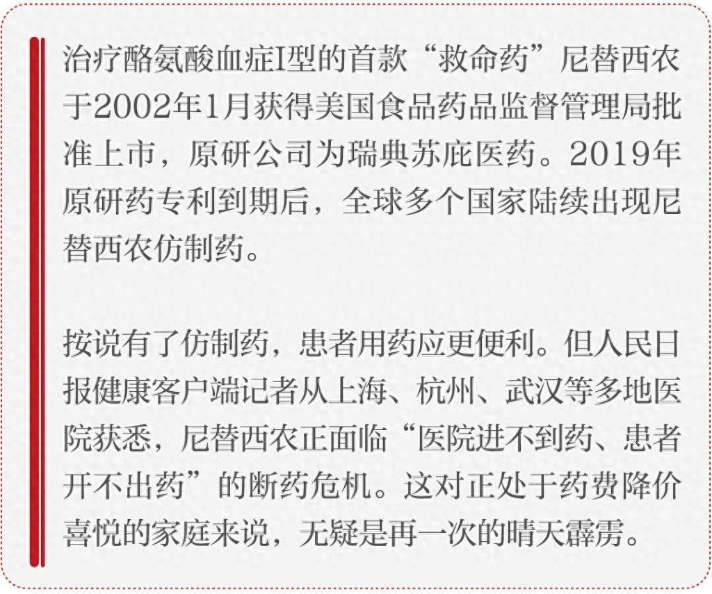 据王杨等患者家属了解,受市场过小、原材料未通过认证等因素影响,汉光药业代理的仿制药已经停产,国内库存耗尽。而苏庇医药生产的原研药虽在我国获批,却未在国内市场销售。1月20日,苏庇医药给人民日报健康客户端记者的回复是:“目前,尼替西农口服混悬液、尼替西农胶囊都暂无在中国进口的计划。”